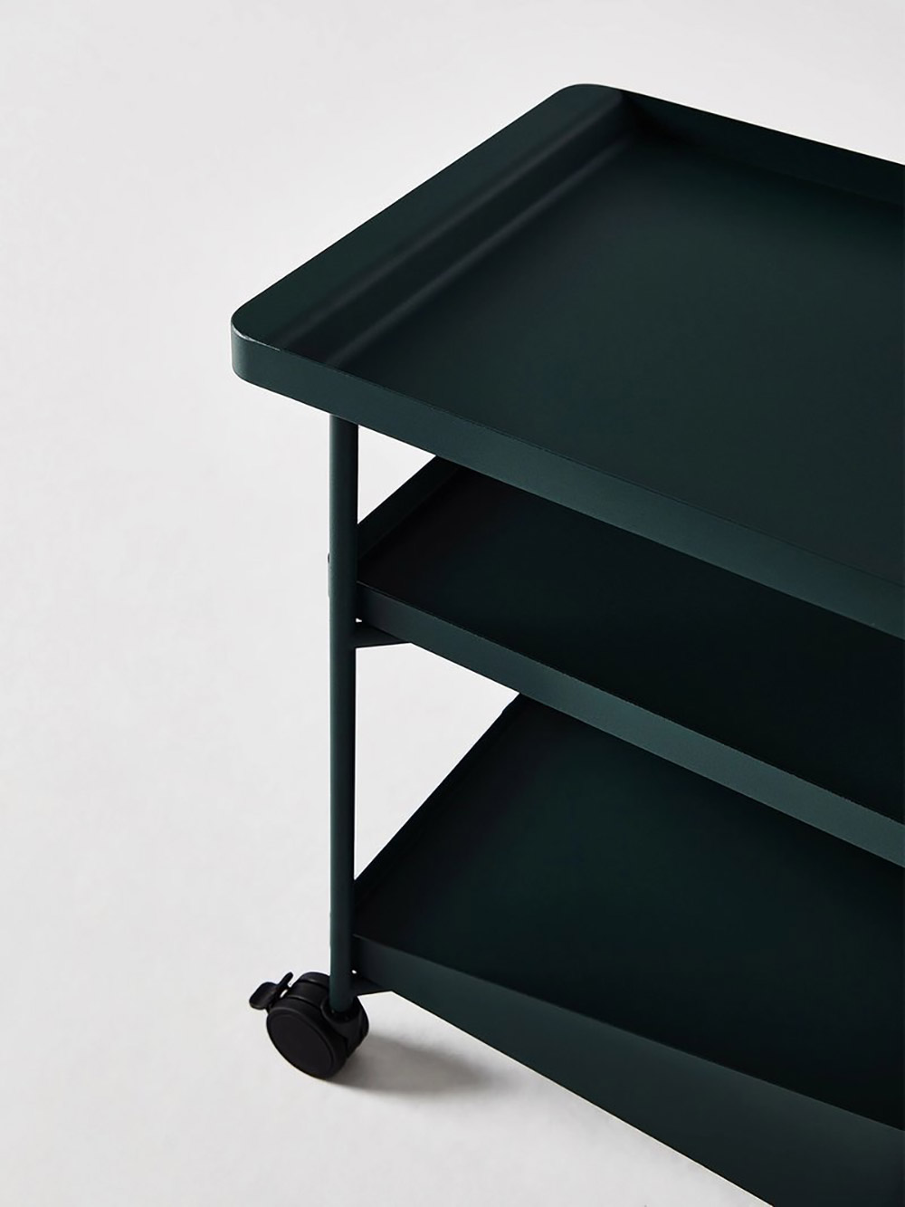 An extension of the Barbican Trolley, Barbican Play is a shorter, more adaptable work cart for the ever-transforming home or office. Designed at a convenient height, the cart easily slides underneath one’s desk and can be accessed by way of a hollow handle meant to be grasped from either the top or the bottom. Three tiers provide a hierarchy of space: a “cargo-hold” at the bottom for larger items, a middle tier for books and accessories, and a low top tray that can accommodate pens, pencils, and office supplies.