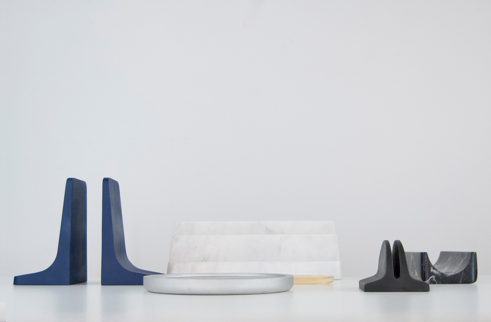 Each object satisfies a specific function for the desk and the home. The collection includes a paperweight which allots a space for more important documents, a two tiered folio holder, bookends, a tray for pens and pencils, and a dish with a sectioned slope, available in three sizes. While each object has a designated primary use, all have been designed to be lived with in a variety of ways.